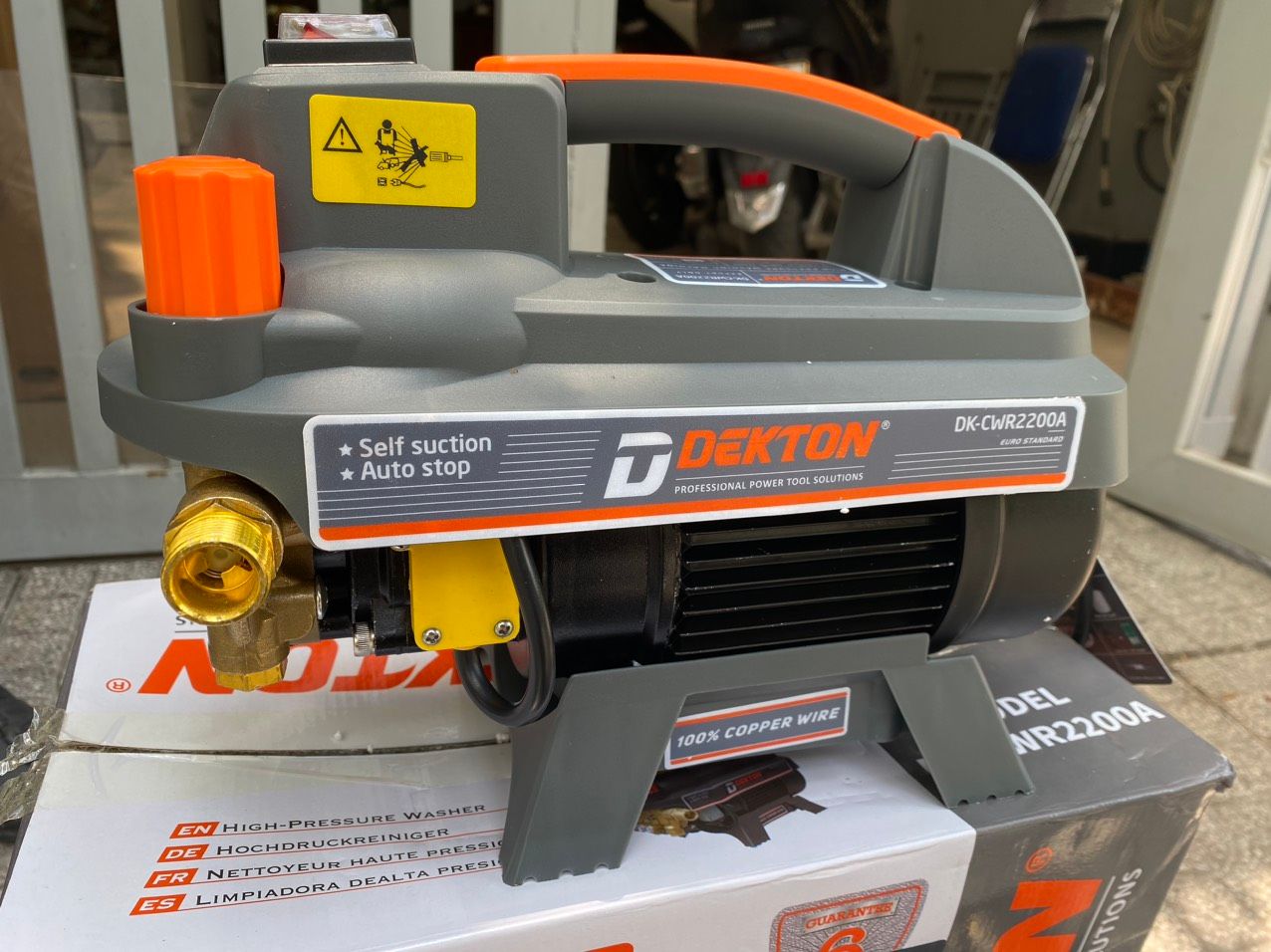 Máy xịt rửa cao áp Dekton DK - CWR 2200A là máy rửa xe mini có công suất 2200 W, sử dụng điện 220V, có thể điều chỉnh áp lực để thực hiện các công việc như rửa xe, rửa máy lạnh, tưới cây...